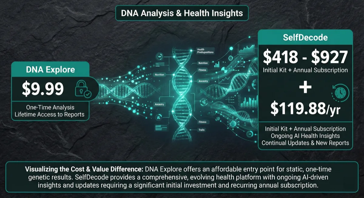 - SelfDecode costs $418–$927 upfront plus $119.88/year; DNA Explore is $9.99 one-time with no subscription